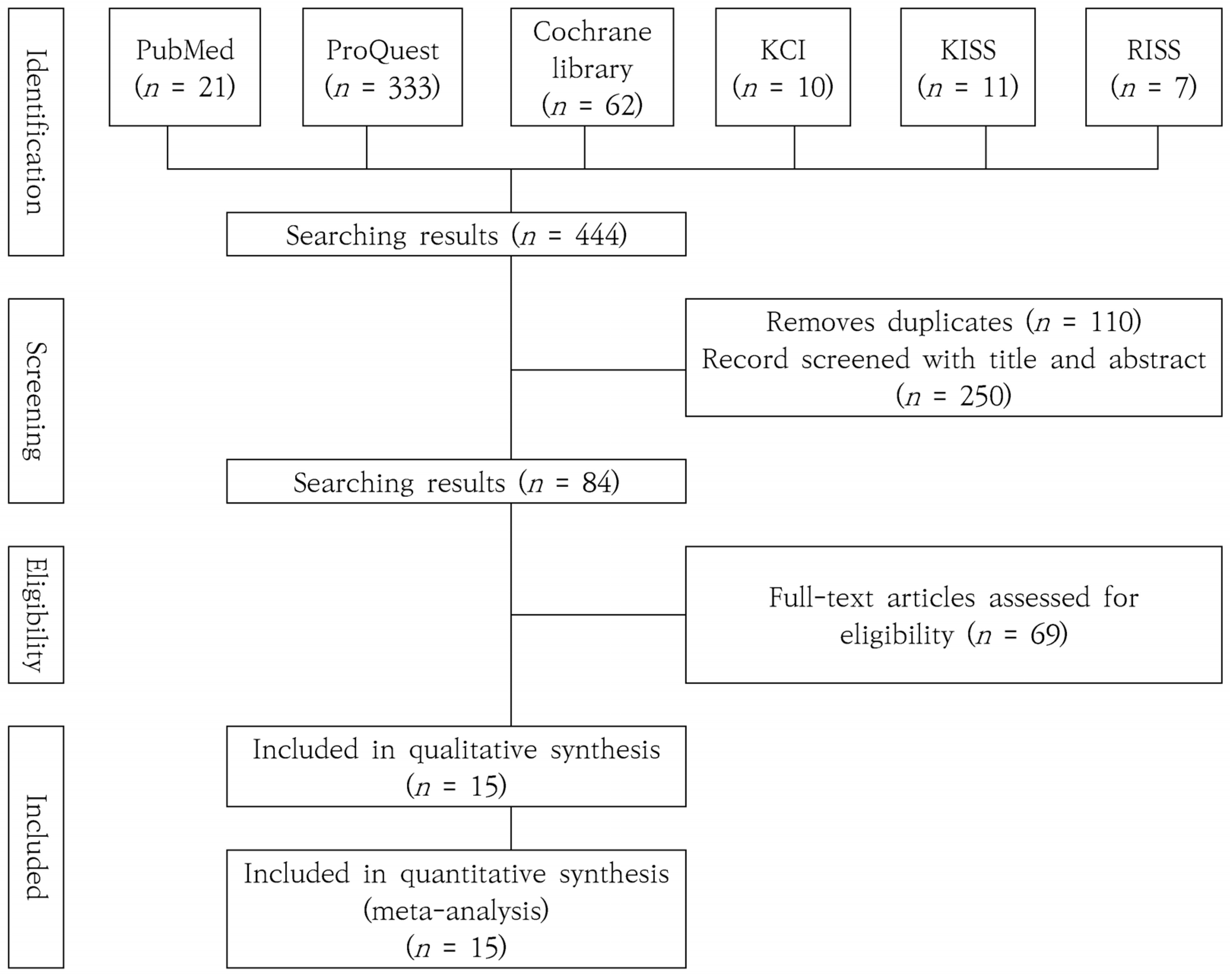 7개의 데이터 베이스에서 검색된 ‘치매’와 ‘디지털 헬 스를 이용한 재활치료’ 관련 문헌 444편에서 중복 제거 110편, 제목과 초록을 검토를 통해 250편을 배제하였다. 남은 84편의 문헌의 전문을 검토하여 최종적으로 15편 의 문헌을 선정하였다(Figure 1).