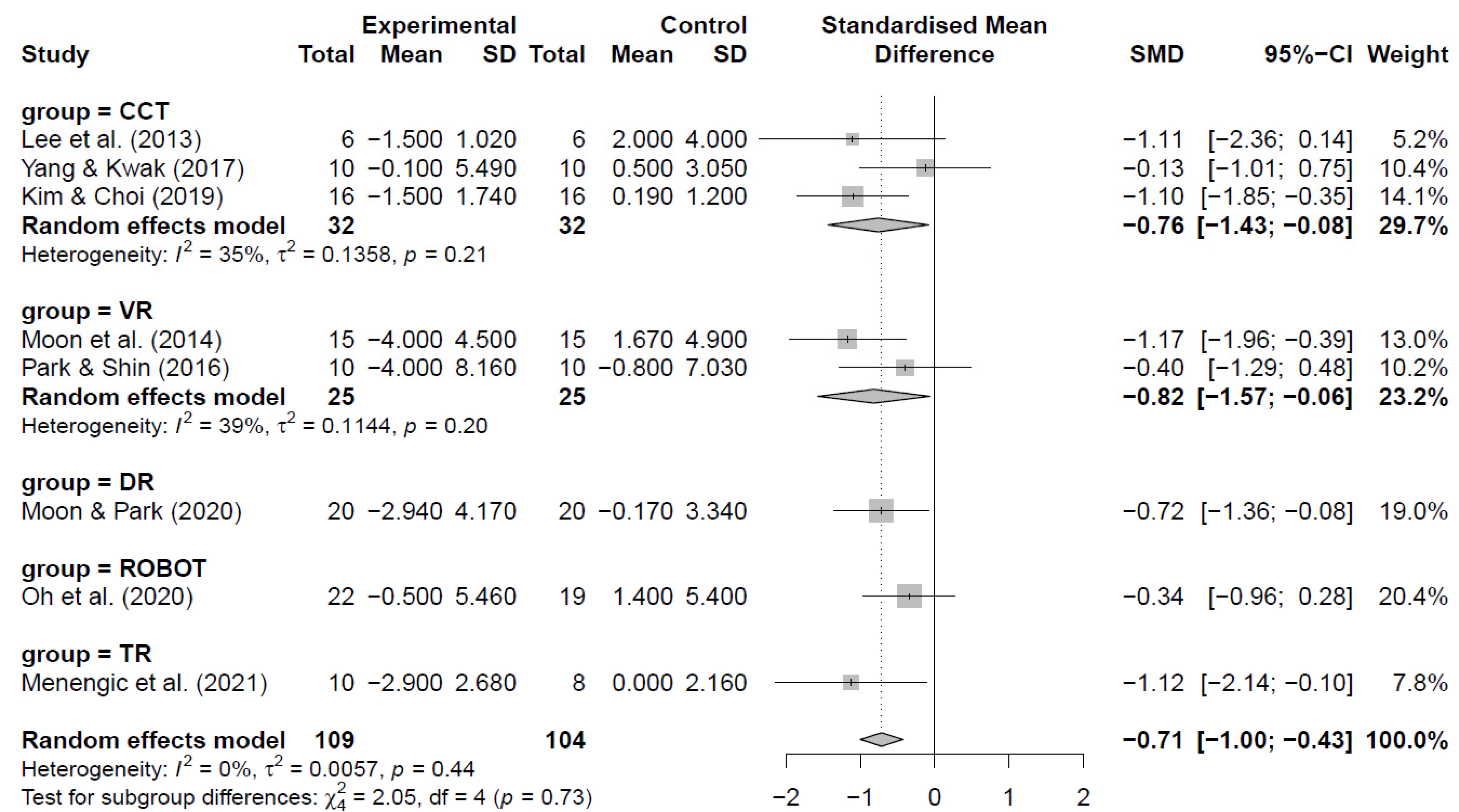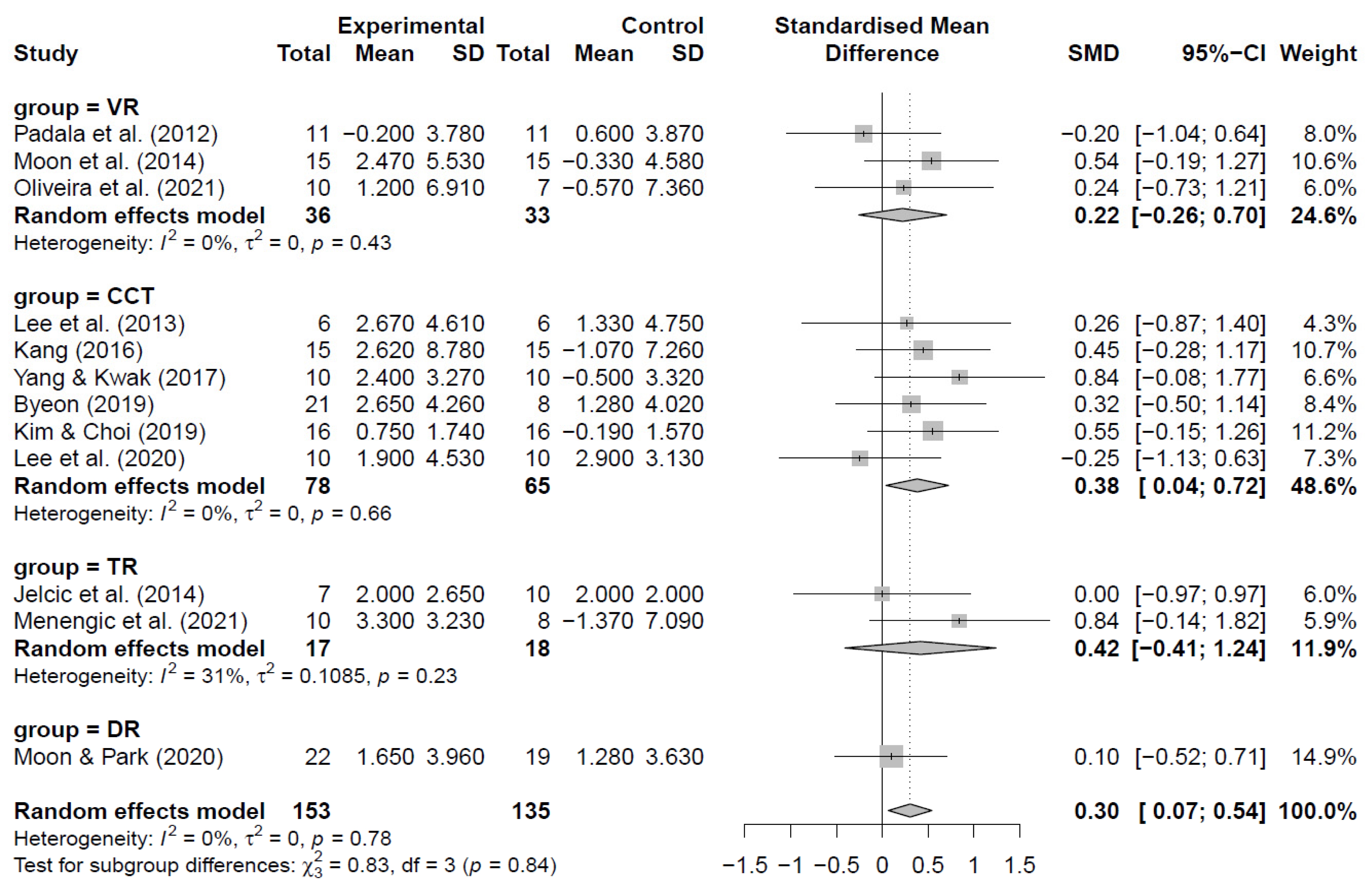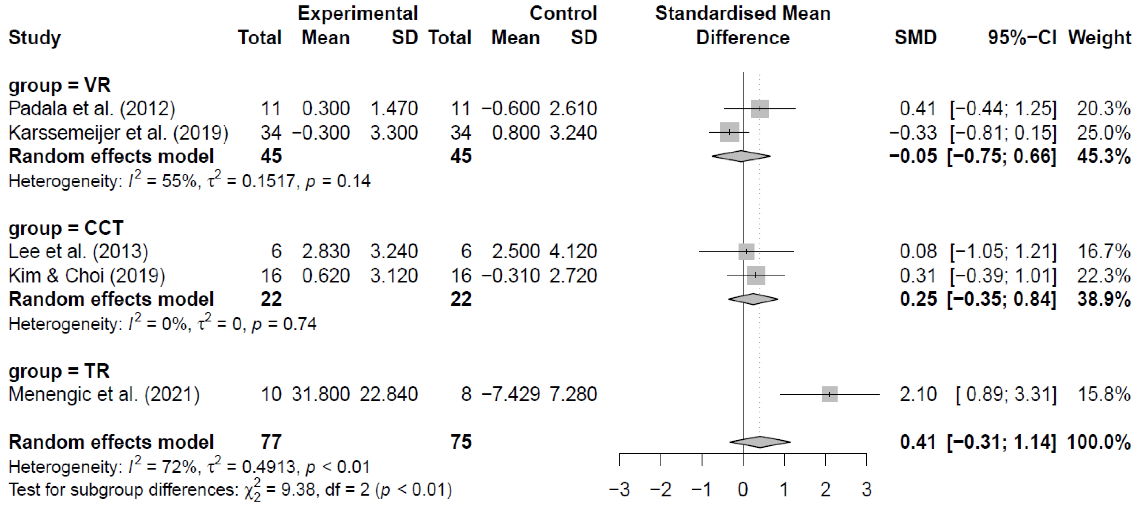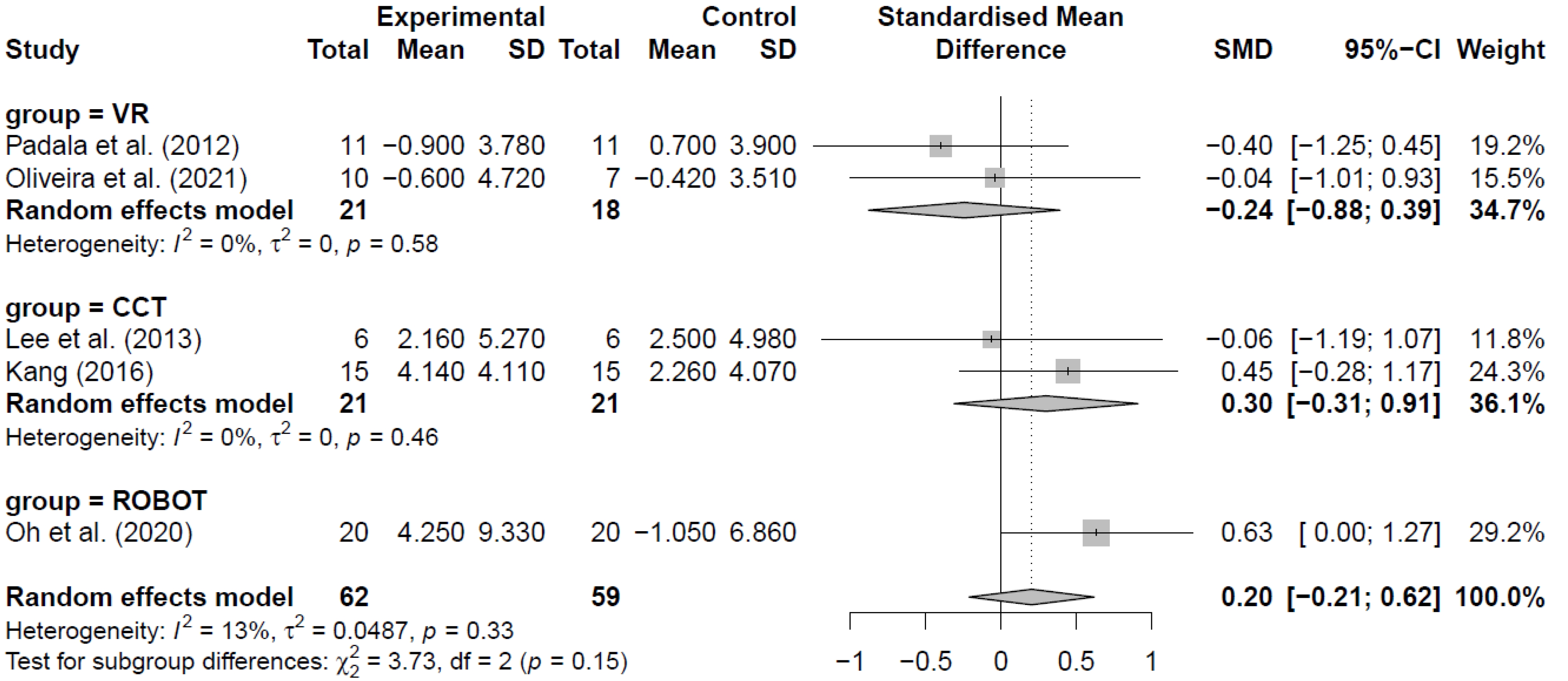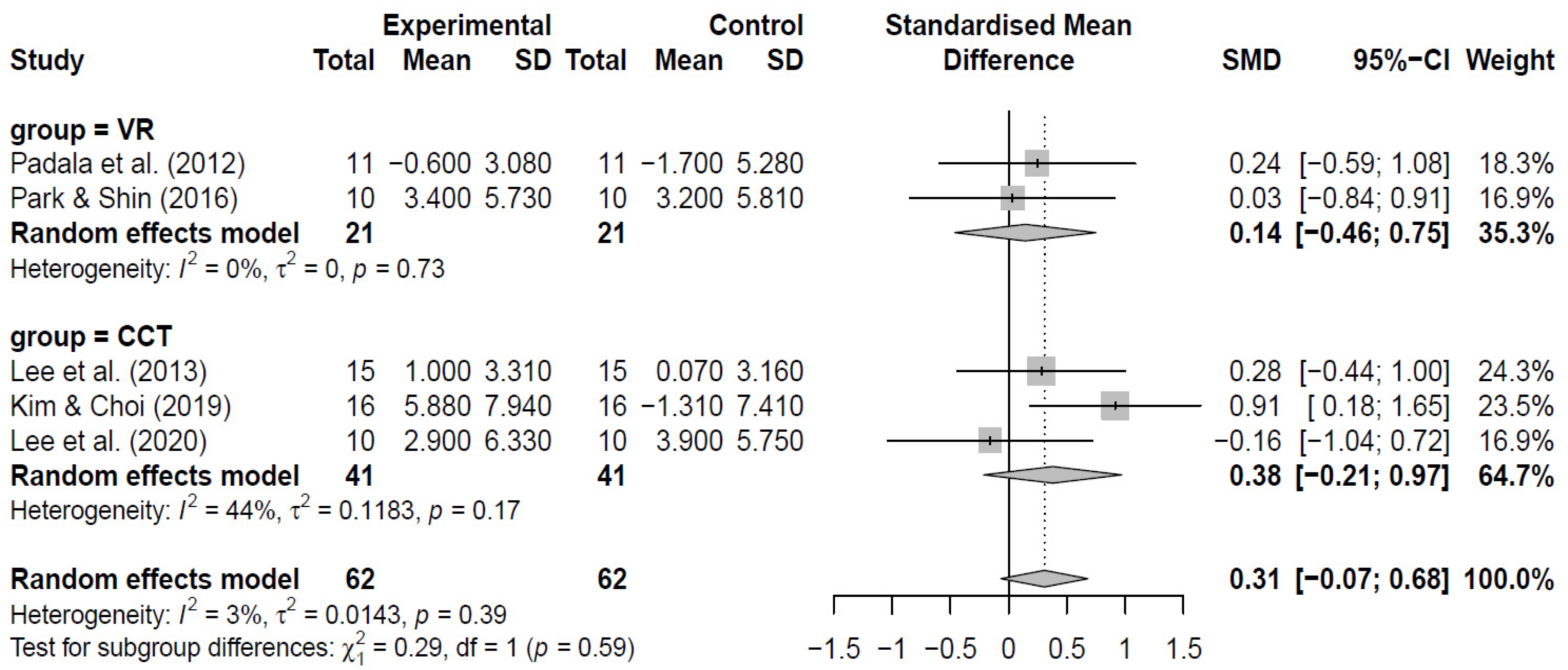 ADL에 대한 전체 효과크기는 중간 효과크기(SMD = 0.41)로 나타났지만 통계적으로 유의하지는 않았다. Wii-Fit을 이용한 가상현실 중재에 관한 무작위 대조군 실험연구에서는 ADL에 유의한 영향을 미치지 않은 것으 로 나타났다([Padala et al., 2012]). 하지만 전산화 인지 재활을 제공한 단일집단 사후 실험연구에서는 ADL에서 유의한 효과를 확인할 수 있었다([Jeong et al., 2010]; [Shon et al., 2013]). 본 연구는 무작위 대조군 실험연구 만을 대상으로 한 메타분석이었으며, 다른 실험설계를 포함하지 않았기에 나타난 결과로 고려된다.