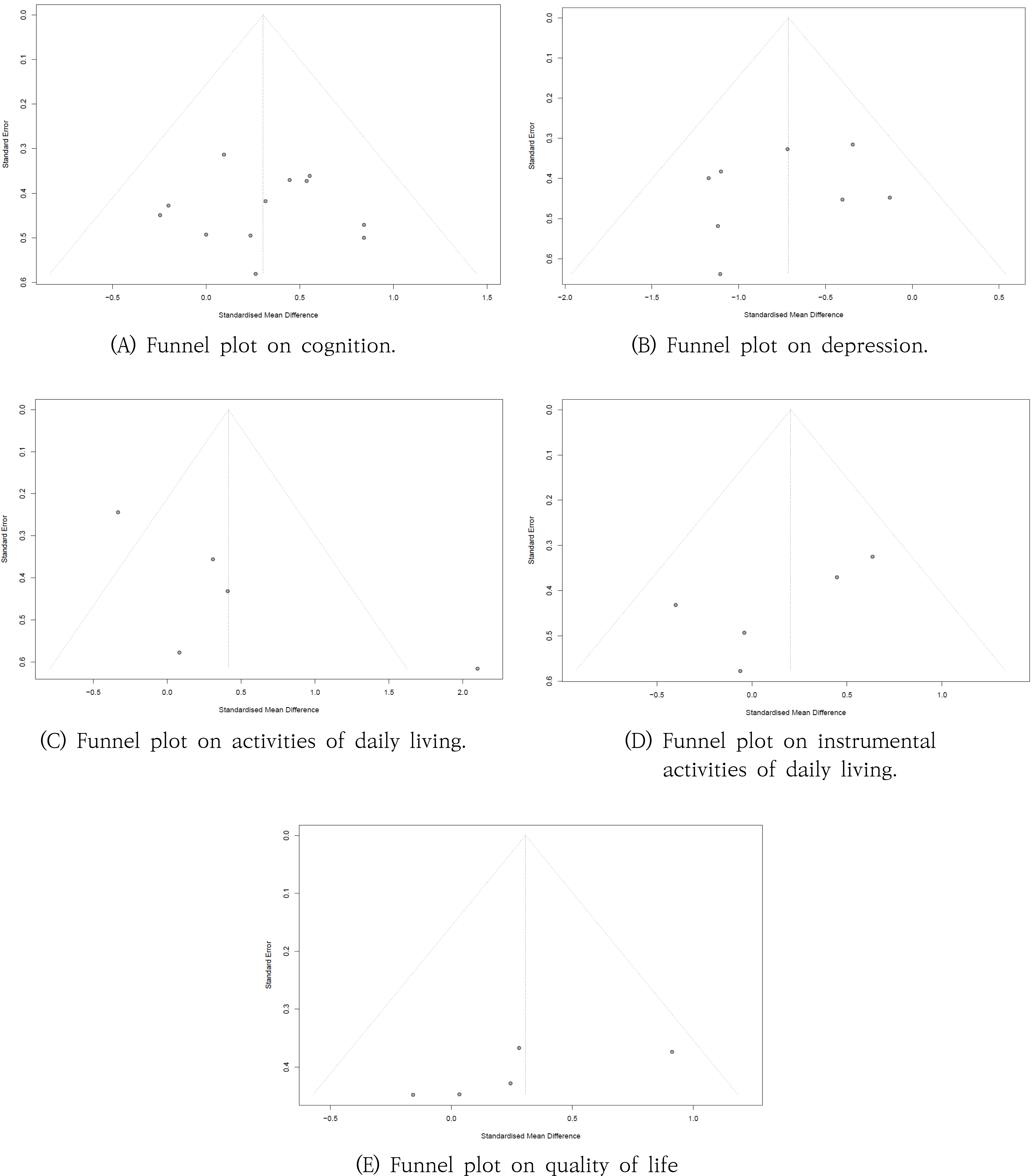 결과 변수들의 출간오류 검정을 위해 시각적으로 funnel plot을 확인한 결과 인지 기능, 우울, IADL, 삶의 질은 funnel plot 안쪽으로 골고루 분포되어 있는 것으 로 나타났다(Figure 7). 하지만 ADL의 funnel plot의 경 우, 비대칭적이었다(Figure 7 - (c). Egger’s regression 을 시행한 결과, ADL은 bias = 4.07 (t = 2.34, degree of freedom = 3, p = 0.10)로 효과크기와 표준오차의 관계가 통계적으로 유의미하지 않아 출판편향은 없는 것 으로 나타났으며, 나머지 변수에서도 통계적으로 출간오 류가 없는 것으로 나타났다.