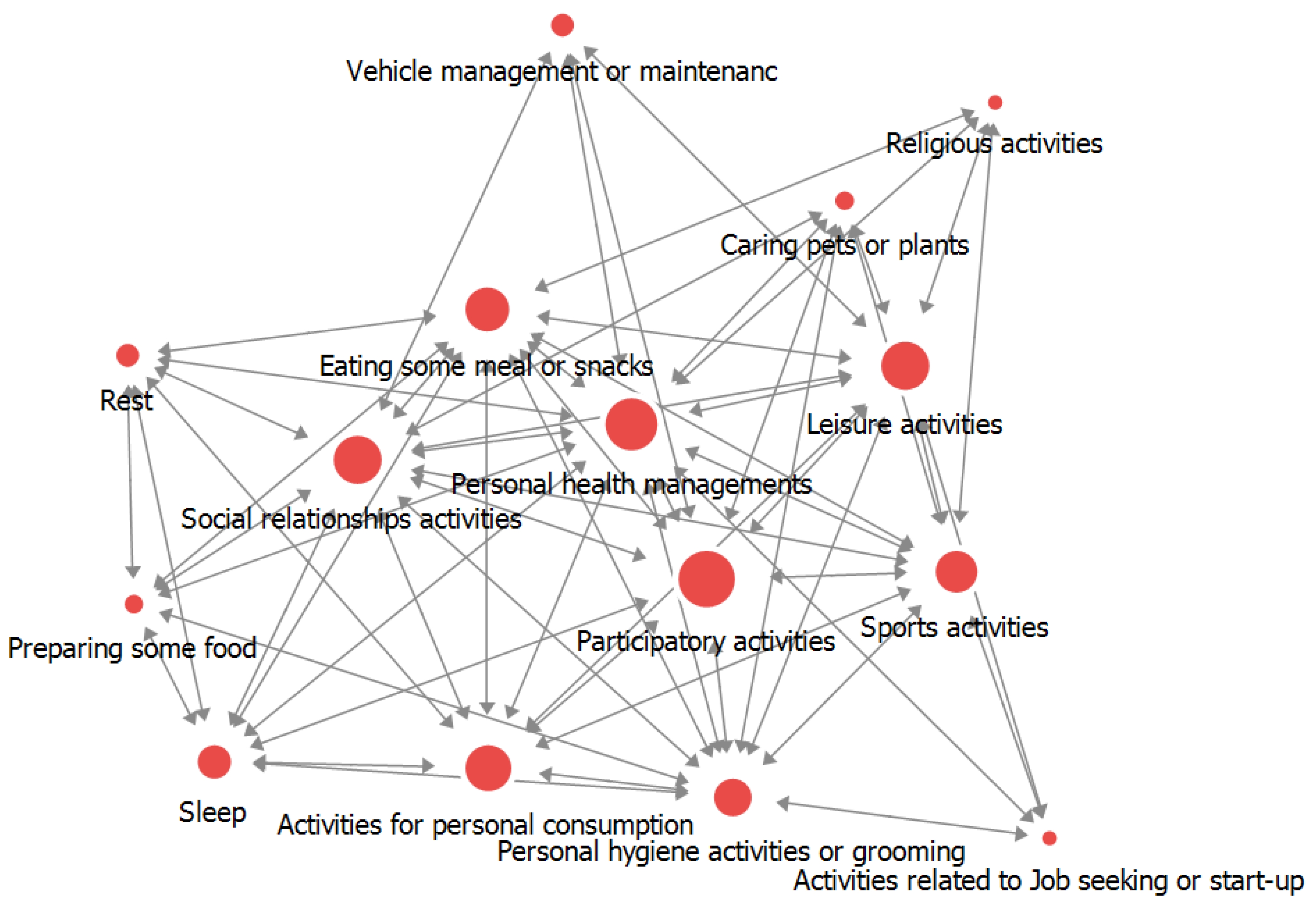 Results: The network distribution showed a density of 0.60 (60%), mean degree of 8.4, mean distance of 1.4, inclusiveness of 1.0 (100%), and no isolated nodes. In the results, both the centrality of in-degree and out-degree were high in the order of participatory activity, personal health care, and social activities. Regarding betweenness centrality, personal healthcare was ranked the highest, followed by social activities, and leisure activities.