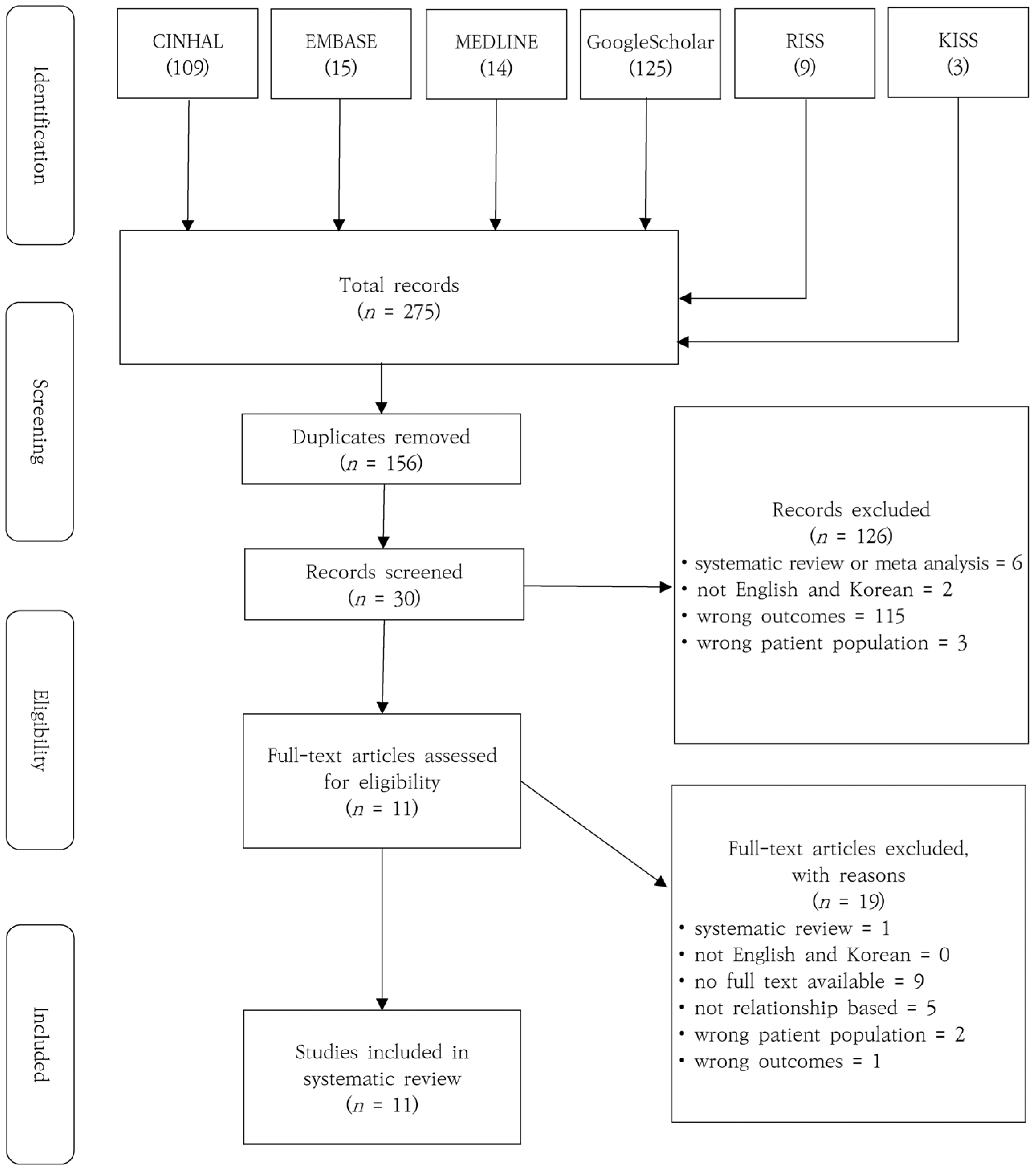 Methods: Databases were collected using Cumulative Index of Nursing and Allied Health Literature, Excerpta Media Database, MEDLINE, and Google Scholar. Studies were selected according to the Preferred Reporting Items for Systematic Reviews and Meta-Analyses flowchart. Ultimately, 11 studies were included in the final analysis. These selected studies were evaluated using the qualitative level model of evidence-based studies suggested by Arbesman et al. in 2008.