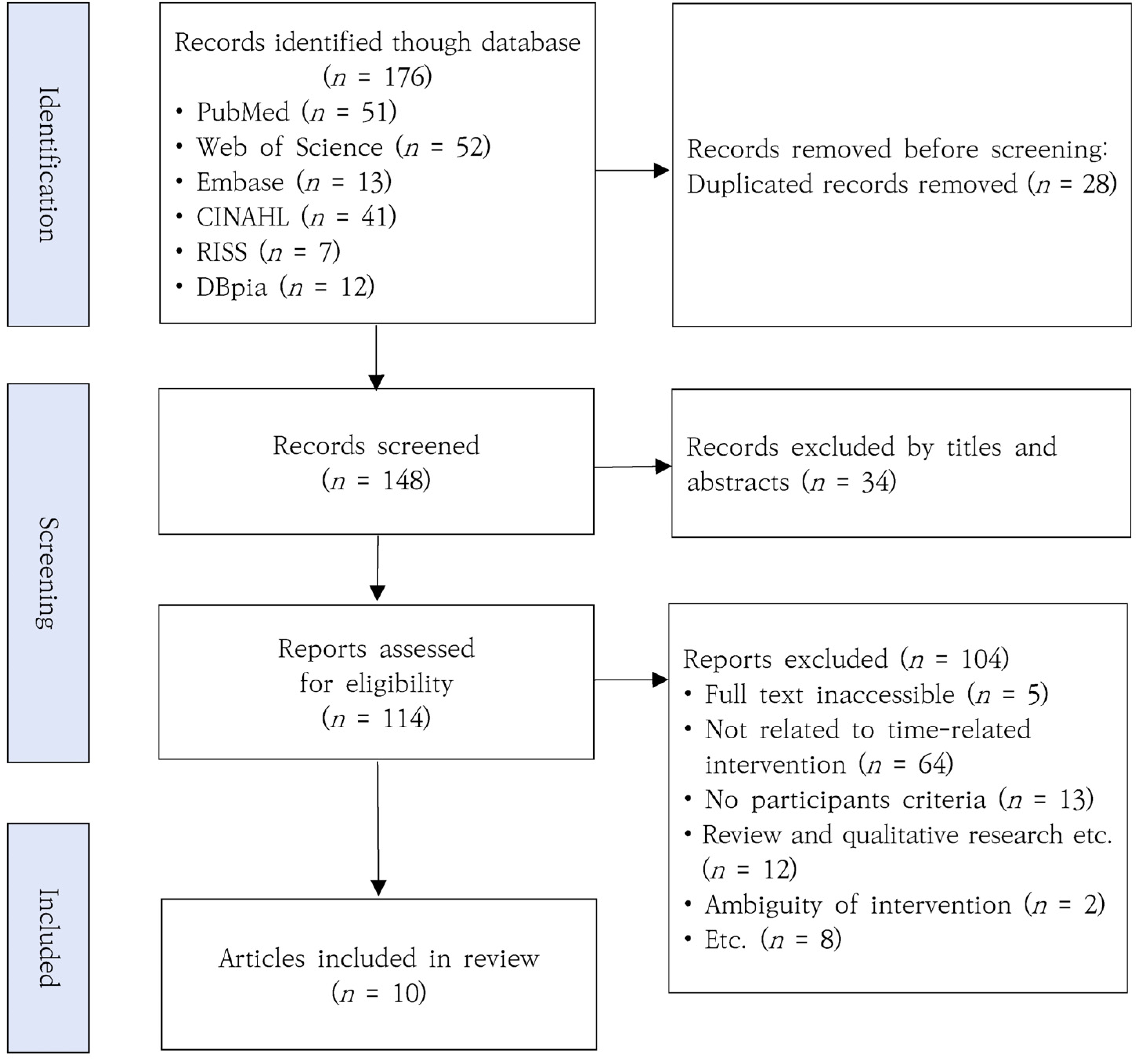 문헌을 선별하기 위해 PRISMA 가이드라인을 따라서 세 명의 연구자가 데이터베이스에서 문헌을 검색한 후 서지프로그램을 통해 중복된 문헌을 제거하였다. 검색된 논문은 제목 및 초록을 평가하여 1차로 선별하였고, 전문 (full text)을 분석하여 2차로 선별하였다. 연구 결과의 타당성이 보장되지 않는 학위 논문, 질적 연구 및 상관관 계 연구 등은 제외하였다. 선별 과정에서 3명의 저자가 토의하여 문헌을 선별하였다. 의견이 일치하지 않을 경 우, 연구자 간의 협의를 통해 총 10편이 선정되었다.