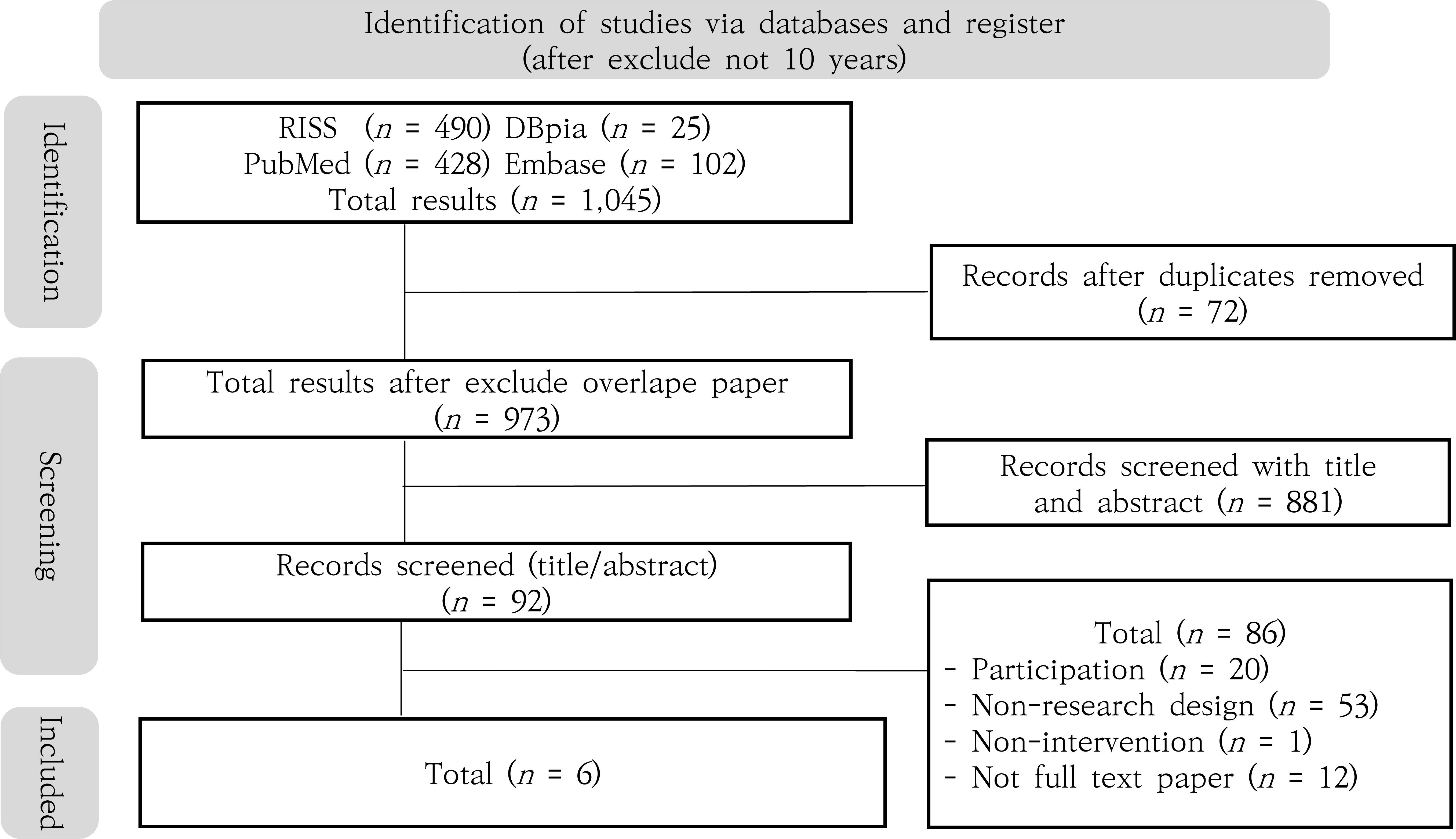 검색 절차에 따라 최종 1,045편의 논문이 검색되었다. 중복된 연구의 편수를 제거한 결과 72편의 논문이 제거 되었다. 논문 제목과 초록을 검토해서 주제와 관련 없는 논문을 확인한 결과 881편의 논문이 제거되었다. 92편 의 논문의 전문을 검토하여 선정 기준에 부합한 연구를 선정하였으며, 배제기준에 부합한 연구 86편 중 독거노 인과 관련 없는 연구 20편, 실험-대조군 연구에 부합하 지 않은 연구 53편, 중재를 진행하지 않은 연구 1편, 전문 을 볼 수 없는 연구 12편 제거되었다. 최종적으로 6편의 논문이 선정되었다(Figure 1).