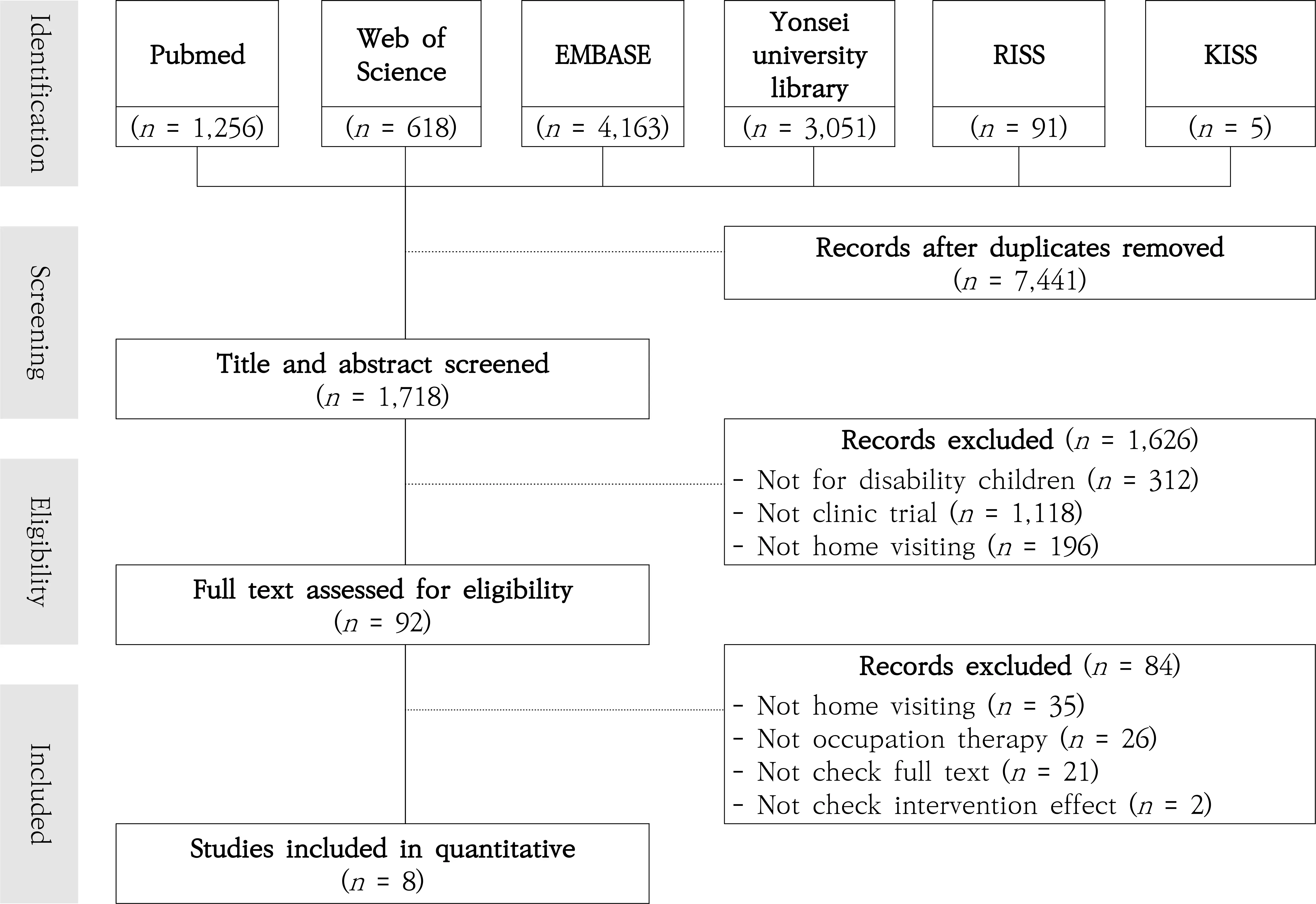 본 연구에서는 2015년부터 2025년까지 게재된 국내 외 연구를 대상으로 수행되었다. 문헌 검색은 2025년 3 월 27일을 기준으로 시행되었으며, 국내 데이터베이스인 KISS와 RISS, 국외 데이터베이스인 Pubmed, Embase, Web of Science가 활용되었다. 또한, 연세대학교 원주 학술정보원에서 국내·외 문헌을 모두 검색하였다. 문헌 검색 과정에서는 PICO (Participant, Intervention, Comparison, Outcome) 구조를 참고하되, 연구 목적 에 따라 대조군을 포함하지 않은 연구도 분석 대상으로 포함하였기에 대조군(Comparison) 항목은 검색어 구 성에서 제외하였다. 국내 검색어는 “아동” AND “장애” AND “가정” AND “작업치료”를 사용하였으며, 국외 검 색어는 “disability” OR “disorder” AND “child” OR “children” AND “home program” OR “home service” OR “home based” OR “home visiting” AND “occupation”으로 설정하였다. 본 연구의 선정 기준과 배제 기준은 다음과 같다.