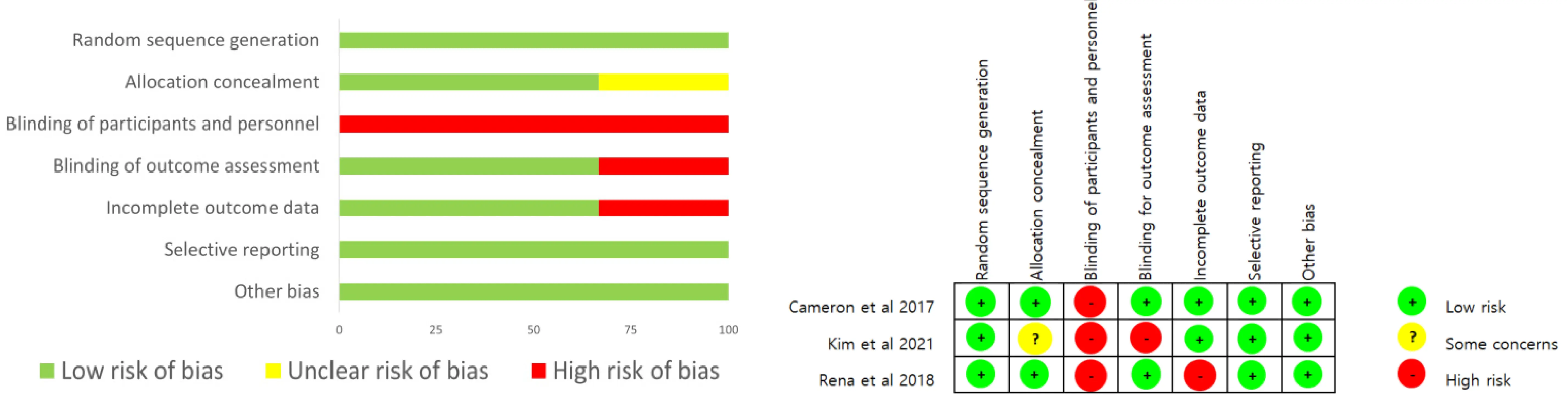 RoB는 무작위 배정순서 생성(random sequence generation), 배정순서 은폐(allocation concealment), 연구 참가자와 연구자에 대한 눈가림(blinding of participants and personnel), 결과 평가자에 대한 눈가림 (blinding of outcome assessment), 불완전한 결과자료 (incomplete outcome data), 선택적 결과 보고(selective reporting), 그 외 잠재적 비뚤림(other bias)의 총 7가 지 평가 영역으로 구성되며, 각 항목은 높음(high risk of bias), 불확실함(unclear risk of bias), 낮음(low risk of bias)의 3단계로 평가되었다.