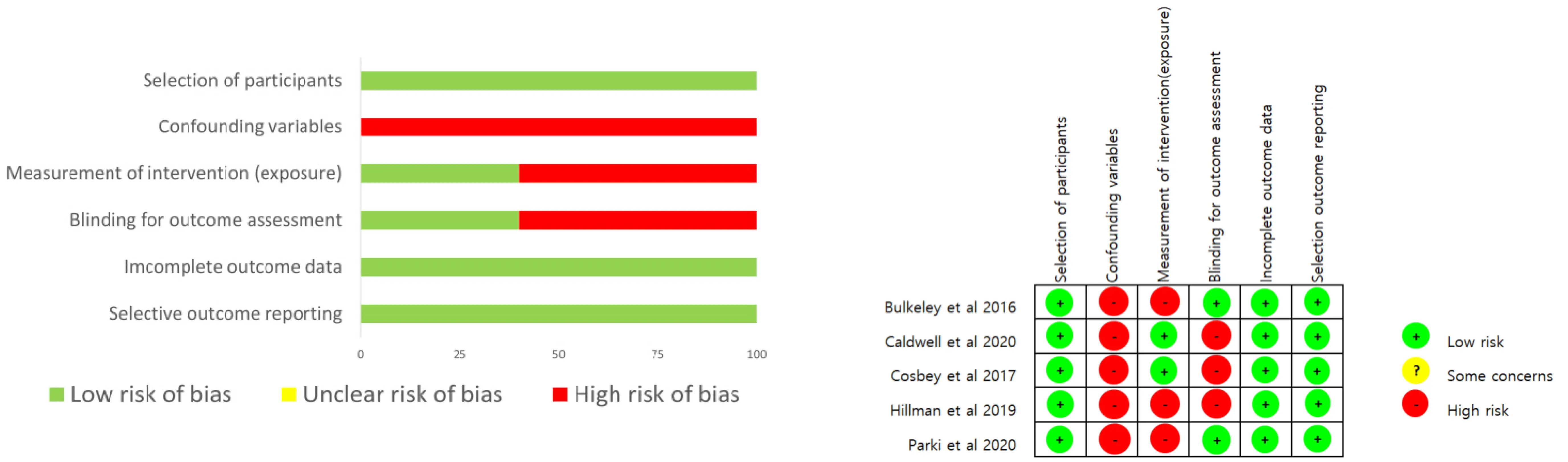 RoBANS 분석 결과, 대상군 선정, 불완전한 자료, 선 택적 결과보고 항목에서는 5편 모두 낮은 비뚤림 위험으 로 평가되었다. 중재(노출) 측정과 결과 평가에 대한 눈가 림 항목에서는 각각 1편이 낮은 비뚤림 위험, 나머지 2편 은 높은 비뚤림 위험으로 평가되었다. 마지막으로 교란 변수 항목에서는 5편 모두 높은 비뚤림 위험으로 평가되 었다(Figure 3).