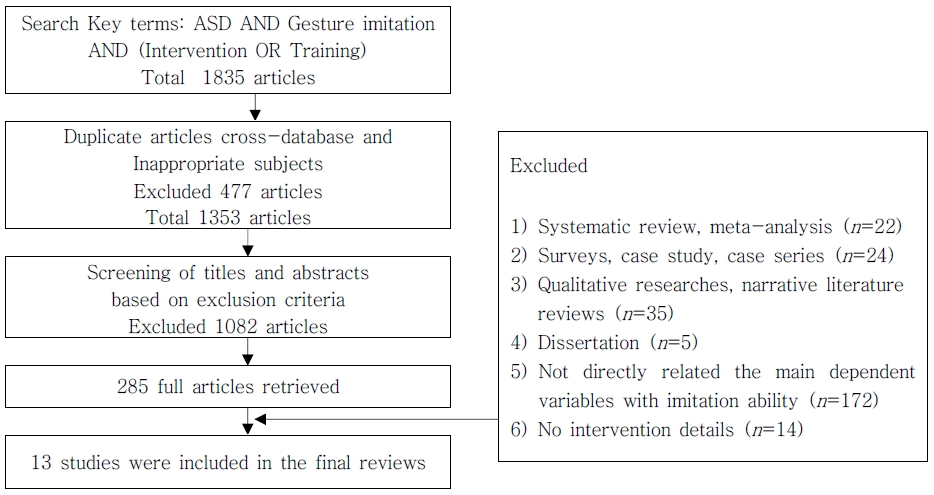 2006년 1월부터 2016년 7월까지 최근 10년 동안 해외 학회지에 게재된 논문을 ProQuest, PubMed, MEDLINE 과 Scopus를 통하여 검색하였다. 주요 검색용어는 “ASD AND Gesture imitation AND (Intervention OR Training)”를 사용하였다. 국내학회지에 게재된 논문의 경우 RISS, KISS, 국립중앙도서관을 통하여 “자폐 AND 모방 AND 중재”의 용어로 검색하였다. 각 데이터 베이스에서 검색된 총 1835개의 문헌 중 데이터베이스 간 중복된 논문과 중재대상이 fragile-X syndrome, williams syndrome을 포함하여 자폐범주성장애에 속하 지 않거나, 자폐범주성장애 성인인 경우는 목록에서 제외 하였다. 그 결과 1차적으로 총 1353개의 논문(해외 1329 개, 국내 24개)이 선정되었다. 2차적으로 자폐범주성장애 의 특징과 관련한 연구, 평가도구의 신뢰도와 타당도에 관한연구 등을 제외하여 중재방법에 대한 285개(해외 266개, 국내19개)의 논문을 선별하였고, 이후 아래의 배 제기준에 따른 분석을 통하여 최종적으로 13개의 논문 을 본 연구의 분석대상으로 사용하였다(Figure 1).